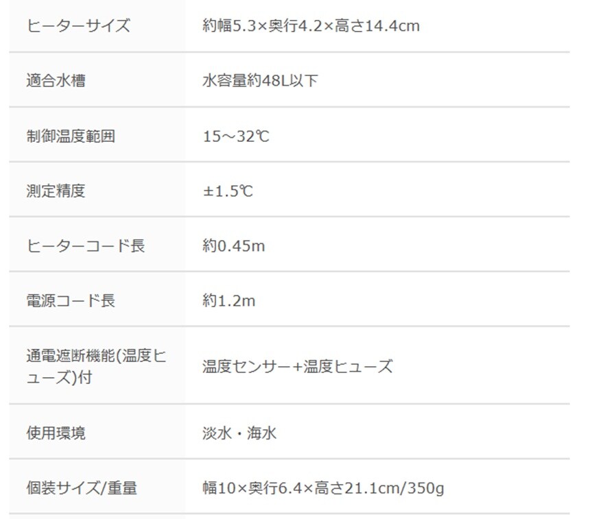 ・「うっかり」対応・・・万が一空気中に出ても温度センサーが働き、安全な表面温度にコントロール。(ヒーター本体の温度が下がれば、水中で再びご使用いただけます。)