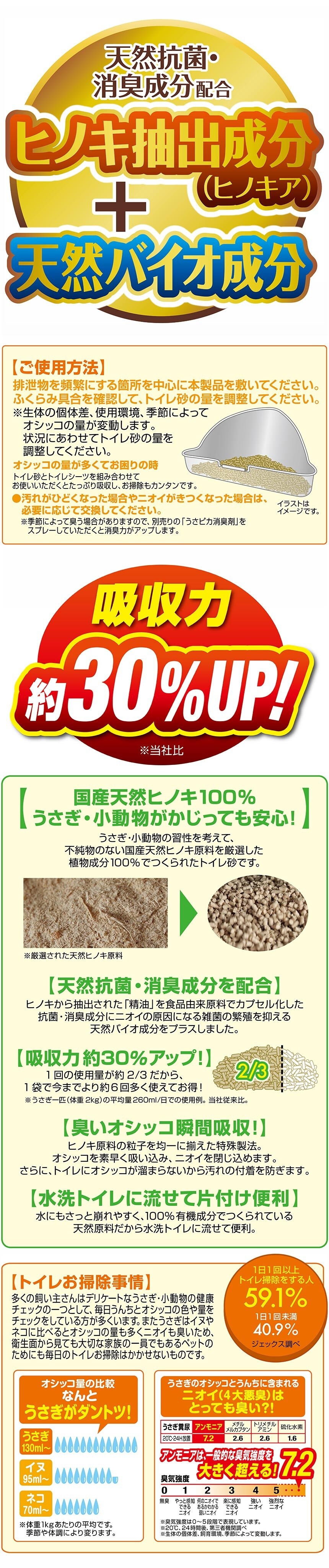 うさぎや小動物の習性を考えて、不純物のない国産天然ヒノキ原料を厳選した植物成分100%で作られたトイレ砂です。かじっても安心。