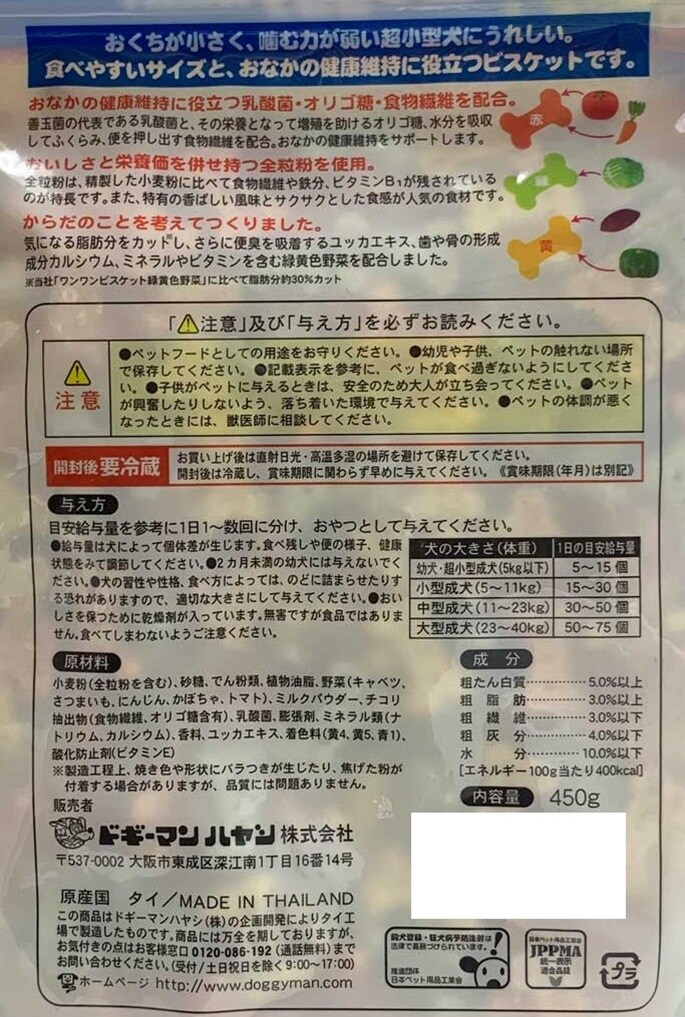 ・気になる低脂肪分※をカットし、さらに便臭を吸収するユッカエキス、歯や骨の形成成分カルシウム、ミネラルやビタミンを含む緑黄色野菜を配合しました。(※)同メーカー商品「ワンワンビスケット緑黄色野菜」に比べて脂肪分約30%カット。