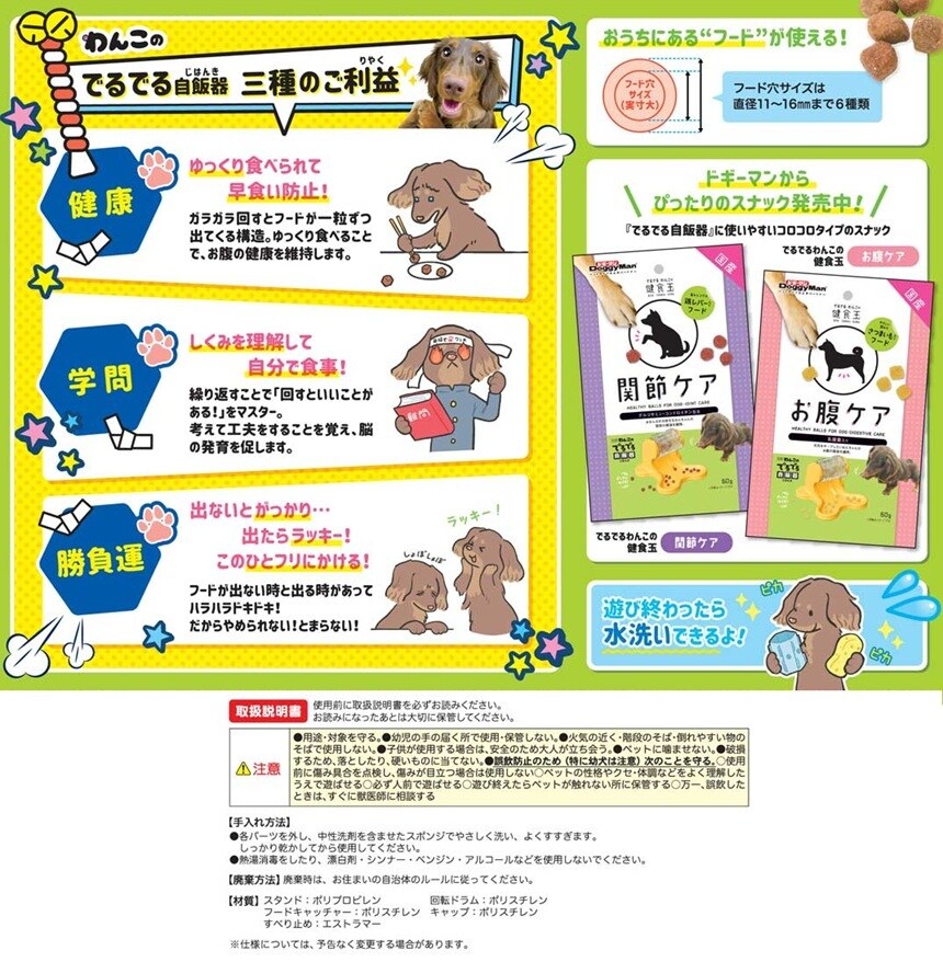 ガラガラ回すとフードが一粒ずつ出てくる構造。ゆっくり食べることで、お腹の健康を維持します。