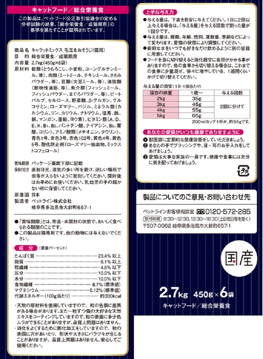 【D】(送料込)キャラットミックス 毛玉をおそうじ 2.7kg(450g×6袋)×4個《沖縄・離島配送不可》