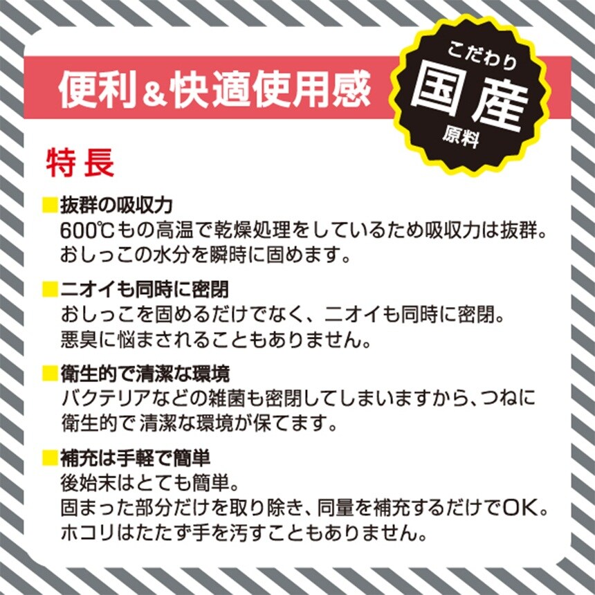 ・600℃もの高温で乾燥処理をしているため吸収力は抜群。おしっこの水分を瞬時に固めます。