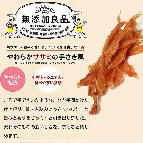・手でちぎれるほどの柔らかさなので、超小型犬、小型犬でも食べやすい大きさにすることができます。保存料、着色料、発色剤、酸化防止剤不使用。