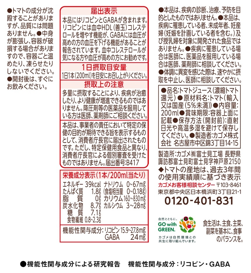 リコピンには血中HDL(善玉)コレステロールを増やす機能が、GABAには高めの血圧を下げる機能があることが報告されています。