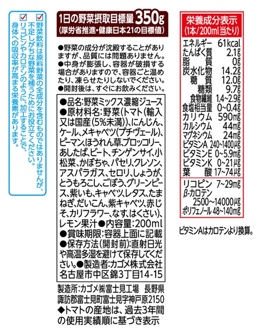 ※1:野菜飲料は原料野菜の全成分を含むものではありませんが、不足しがちな野菜を補うためにお役立てください。