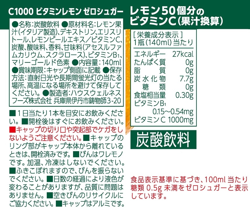 砂糖の摂取を控えて、糖類を気にせずに、ビタミンCが補給できるレモン味の炭酸飲料です