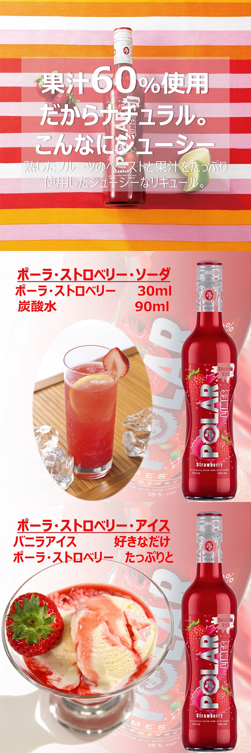 ピュアウォッカをベースに熟した ストロベリー の果肉と ライム の果汁をたっぷりと使用したリキュールです。