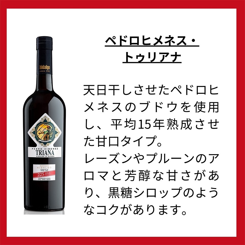 数日間天日干ししたペドロヒメネス種100%使用し平均15年熟成させた甘口タイプ。