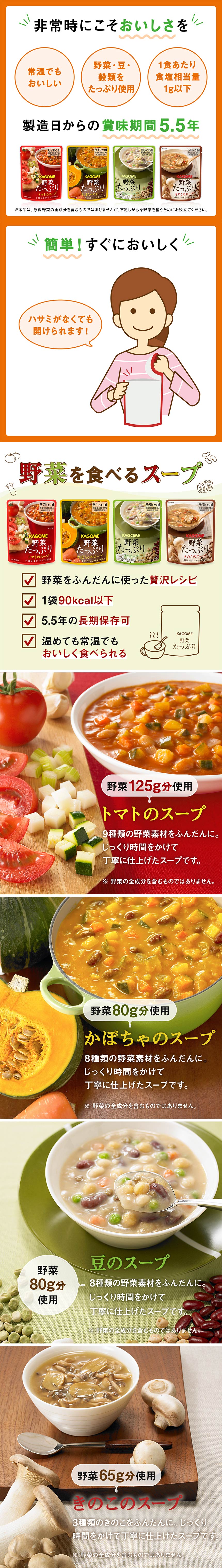 トマト、きのこ、豆、かぼちゃの各スープの味わいが手軽に楽しめます。