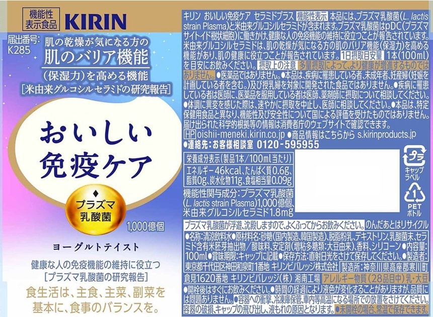 本品には、プラズマ乳酸菌(L. lactis strain Plasma)と米由来グルコシルセラミドが含まれます
