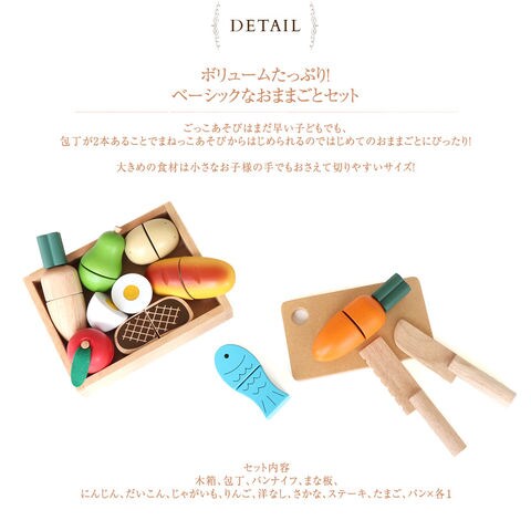 ≪セット内容≫木箱、包丁、パンナイフ、まな板、にんじん、だいこん、じゃがいも、りんご、洋なし、さかな、ステーキ、たまご、パン×各1