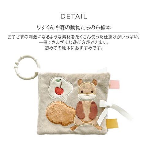 備考:★りすくんや森の動物たちの布絵本。お子さまの刺激になるような素材をたくさん使った仕掛けがいっぱい。一冊でさまざまな遊び方ができます。初めての絵本におすすめです。