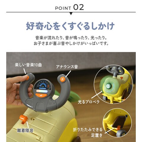 ・楽しい音楽10曲、アナウンス音、クラクション音、離着陸音、音楽といっしょにくるくるピカピカ、折りたたみ出来る足おき
