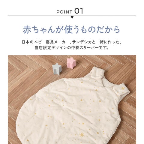 備考:★日本のベビー寝具メーカー、サンデシカと一緒に作った、当店限定デザインの中綿スリーパーです。