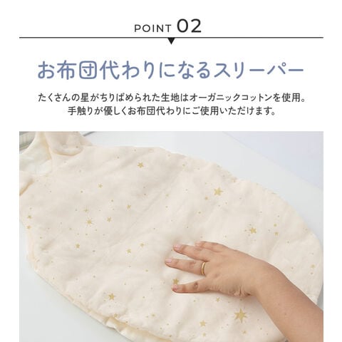 たくさんの星がちりばめられた生地はオーガニックコットンを使用。手触りが優しくお布団代わりにご使用いただけます。
