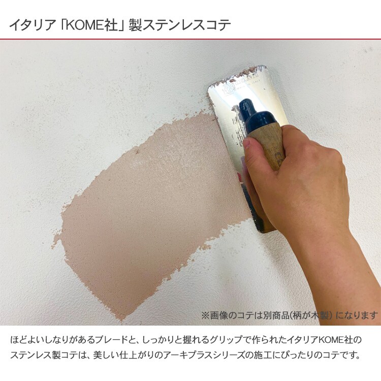 ほどよいしなりがあるブレードと、しっかりと握れるグリップで作られたイタリアKOME社のステンレス製コテは、美しい仕上がりのアーキプラスシリーズの施工にぴったりのコテです。