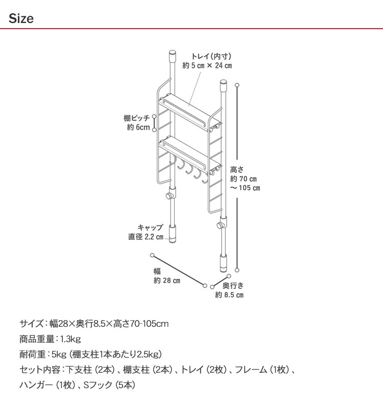 セット内容:下支柱(2本)、棚支柱(2本)、トレイ(2枚)、フレーム(1枚)、ハンガー(1枚)、Sフック(5本)