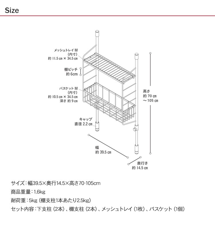 セット内容:下支柱(2本)、棚支柱(2本)、メッシュトレイ(1枚)、バスケット(1個)
