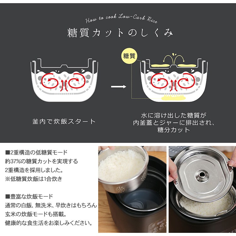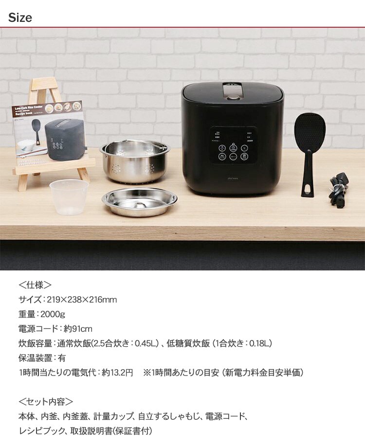 炊飯容量:通常炊飯(2.5合炊き:0.45L)、低糖質炊飯(1合炊き:0.18L)