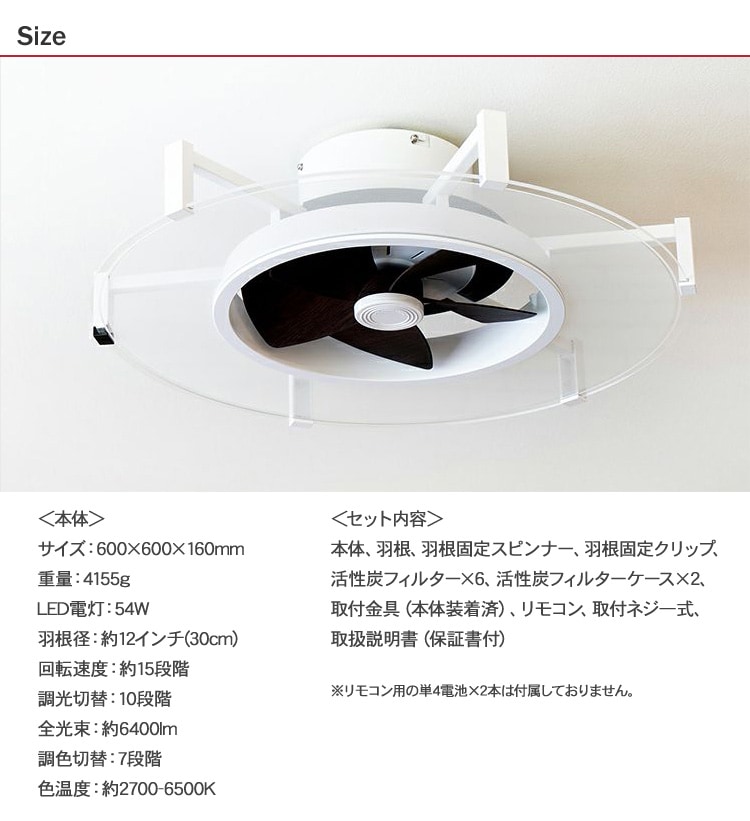 セット:本体、羽根、羽根固定スピンナー、羽根固定クリップ、活性炭フィルター×6、活性炭フィルターケース×2、取付金具(本体装着済)、リモコン、取付ネジ一式、取扱説明書(保証書付)