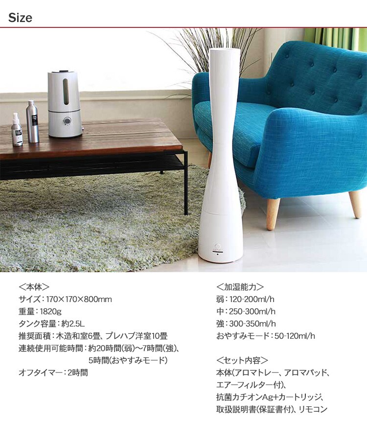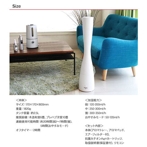 セット:本体(アロマトレー、アロマパッド、エアーフィルター付)、抗菌カチオンAg+カートリッジ、取扱説明書(保証書付)、リモコン(出荷時テスト用電池付属/CR2032:3V)