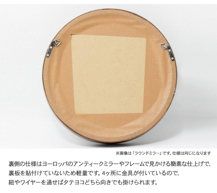裏側はヨーロッパのアンティークミラーやフレームで見かける簡素な仕上げで、裏板を貼付けていないため軽量な仕様となっています。