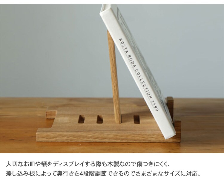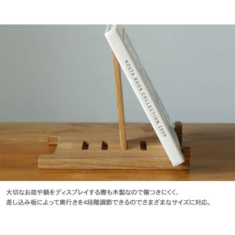 大切なお皿や額をディスプレイする際も木製なので傷つきにくく、差し込み板によって奥行きを4段階調節できるので、さまざまなサイズに対応します。