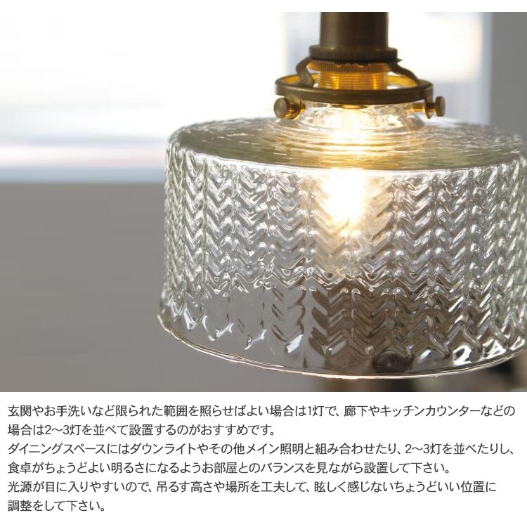 クリアガラスの表面に入った細かな模様が電球の光を和らげるので、目にも優しい明かりです。