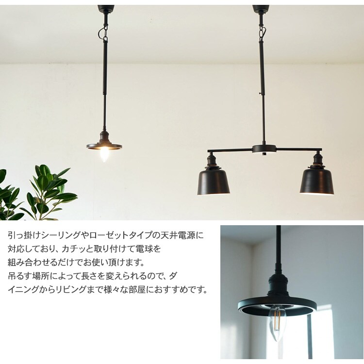 引っ掛けシーリングやローゼットタイプの天井電源に対応しており、カチッと取り付けて電球を組み合わせるだけでお使い頂けます。