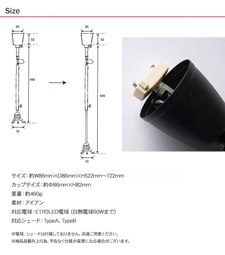 サイズ:約W86mm×D86mm×H522mm~722mm