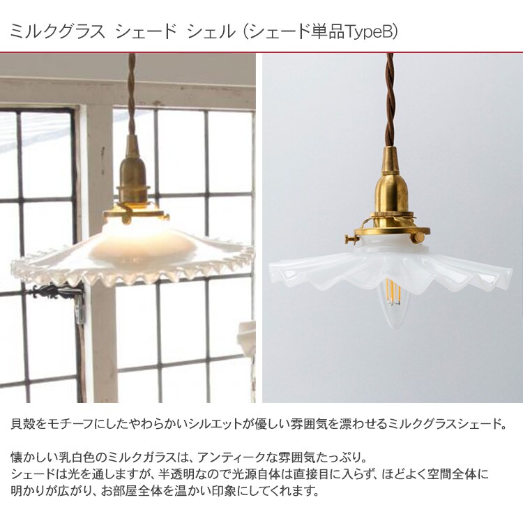 貝殻をモチーフにしたやわらかいシルエットが優しい雰囲気を漂わせるミルクグラスシェード。