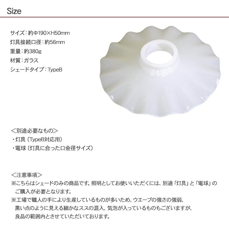 サイズ:約Φ190×H56mm、灯具接続口径:約56mm、重量:約380g、材質:ガラス