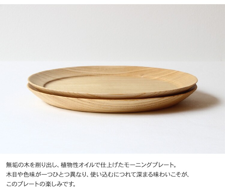 商品説明:無垢の木を削り出し、植物性オイルで仕上げたモーニングプレート。