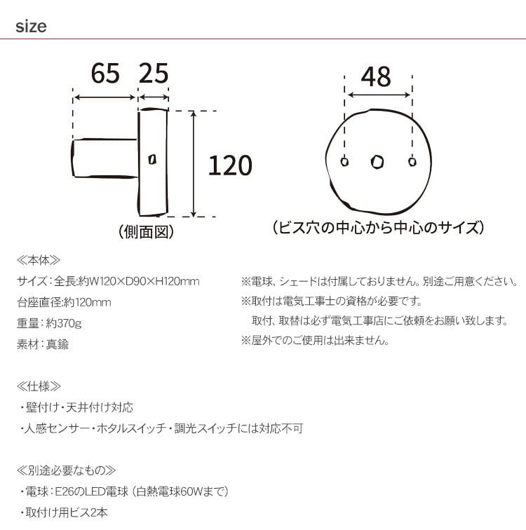 別途必要なもの:E26のLED電球(白熱電球60Wまで)、取付け用ビス2本