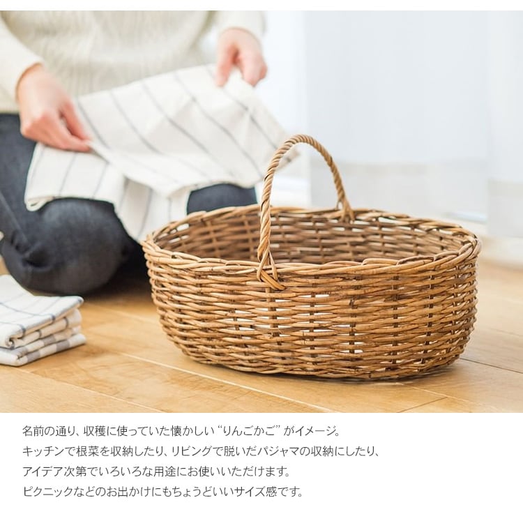 キッチンで根菜を収納したり、リビングで脱いだパジャマの収納にしたり、アイデア次第でいろいろな用途にお使いいただけます。