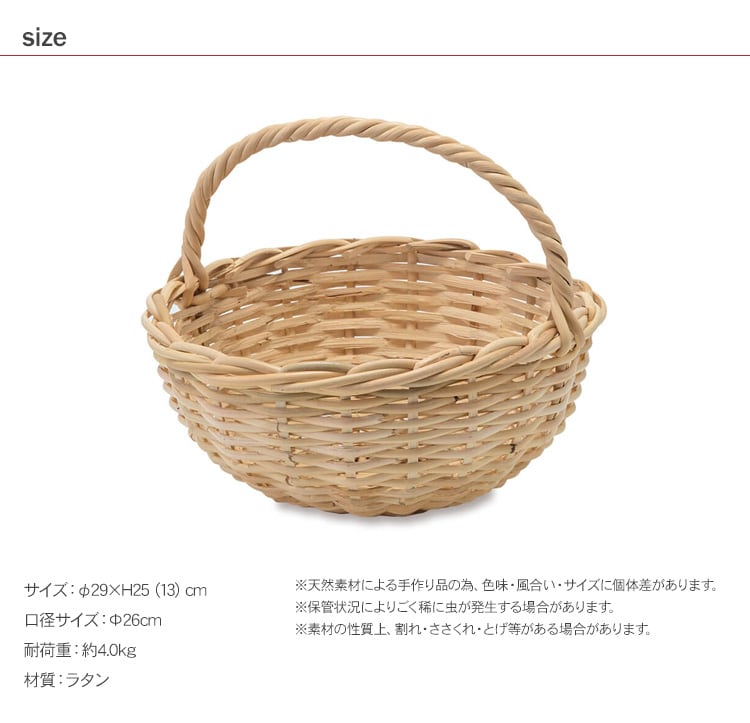 商品説明:職人がひとつひとつ丁寧に編み込んだ天然素材ラタンのバスケット。