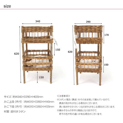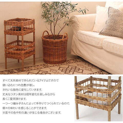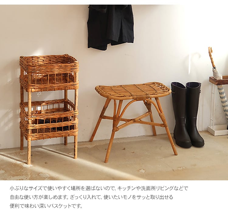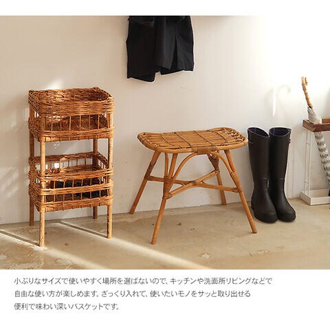 ラタンの風合いがおしゃれな、ヴィンテージデザインのスクエア型2段バスケット。