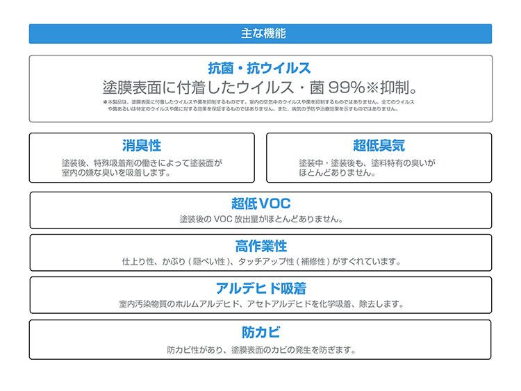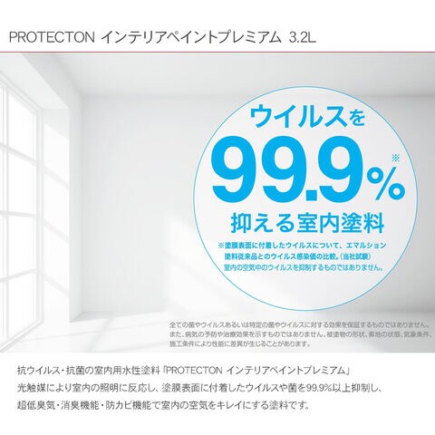 ※本製品は、塗膜表面に付着したウイルスや菌を抑制するものです。室内の空気中のウイルスや菌を抑制するものではありません。