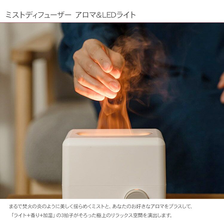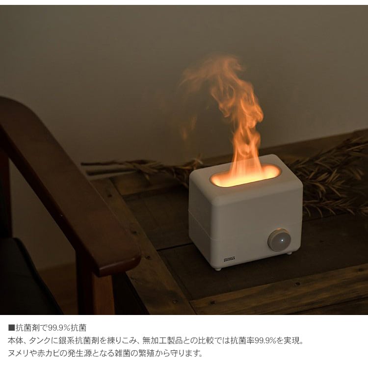 まるで焚火の炎のように美しく揺らめくミストと、あなたのお好きなアロマをプラスして、「ライト+香り+加湿」の3拍子がそろった極上のリラックス空間を演出します。