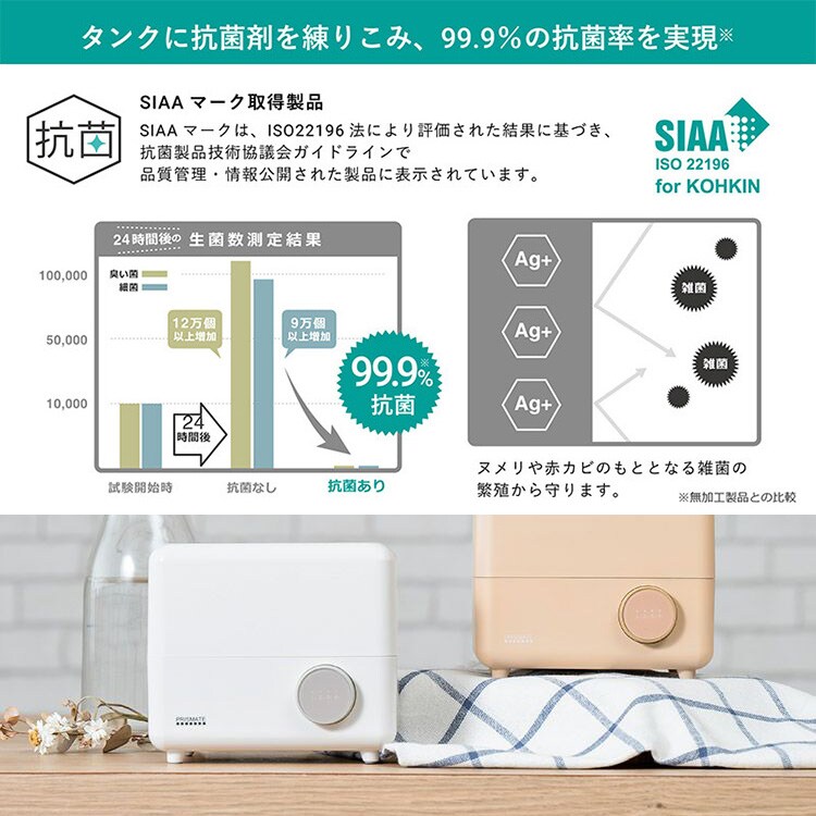 本体、タンクに銀系抗菌剤を練りこみ、無加工製品との比較では抗菌率99.9%を実現。