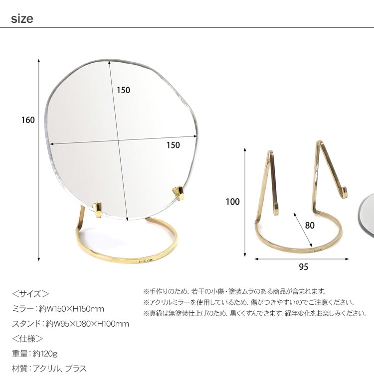 サイズ:ミラー:約W150×H150mm、スタンド:約W95×D80×H100mm