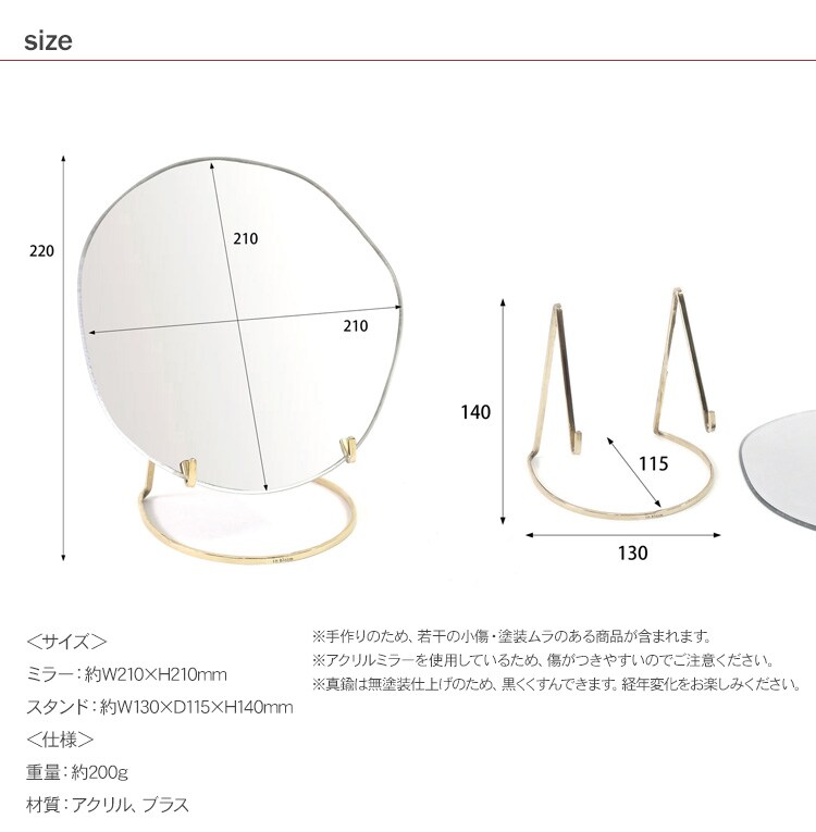 サイズ:ミラー:約W210×H210mm、スタンド:約W130×D115×H140mm