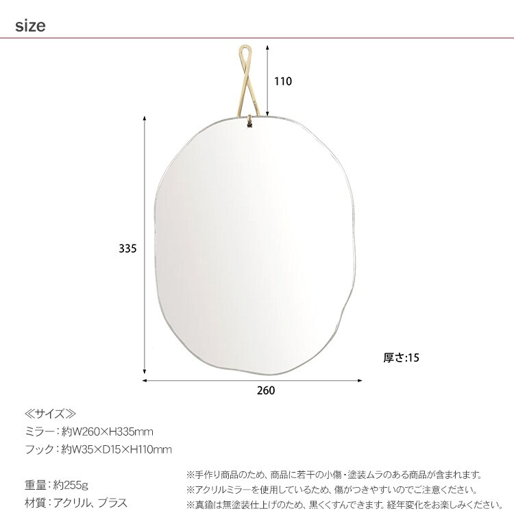 サイズ:ミラー:約W260×H335mm、フック:約W35×D15×H110mm