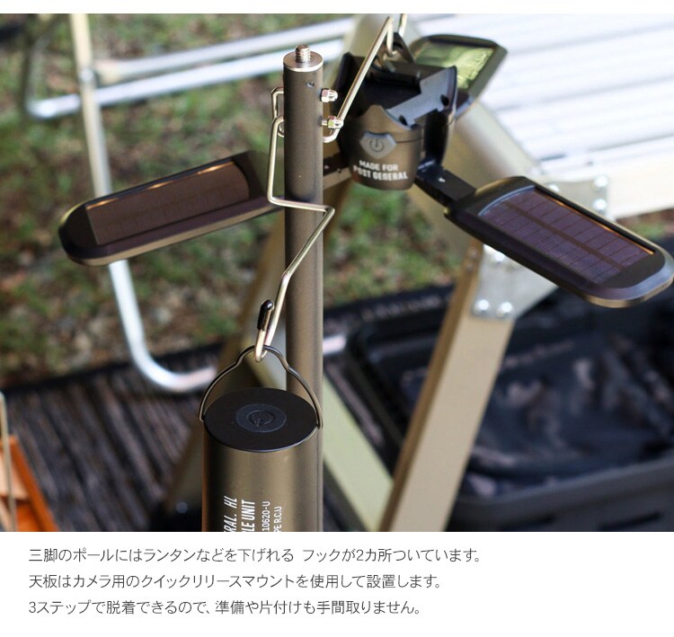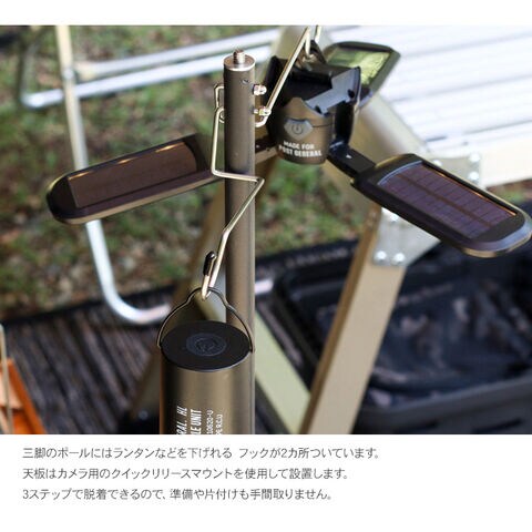 また、三脚のポールにはランタンなどを下げれる フックが2カ所ついています。天板はカメラ用のクイックリリースマウントを使用して設置します。