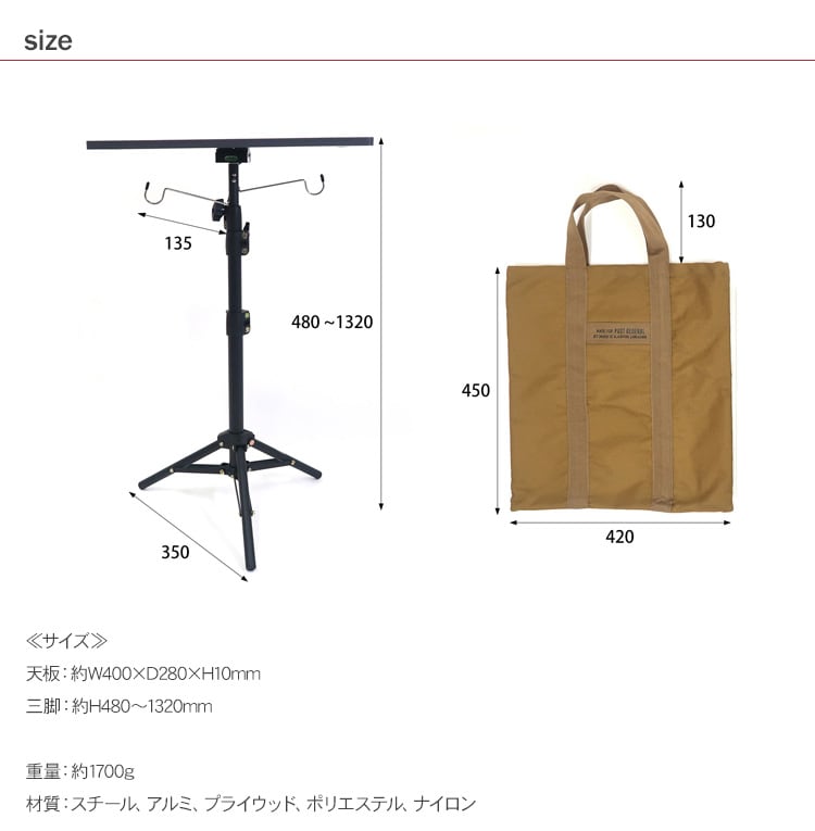 サイズ:天板(約W400×D280×H10mm)、三脚(約H480~1320mm)