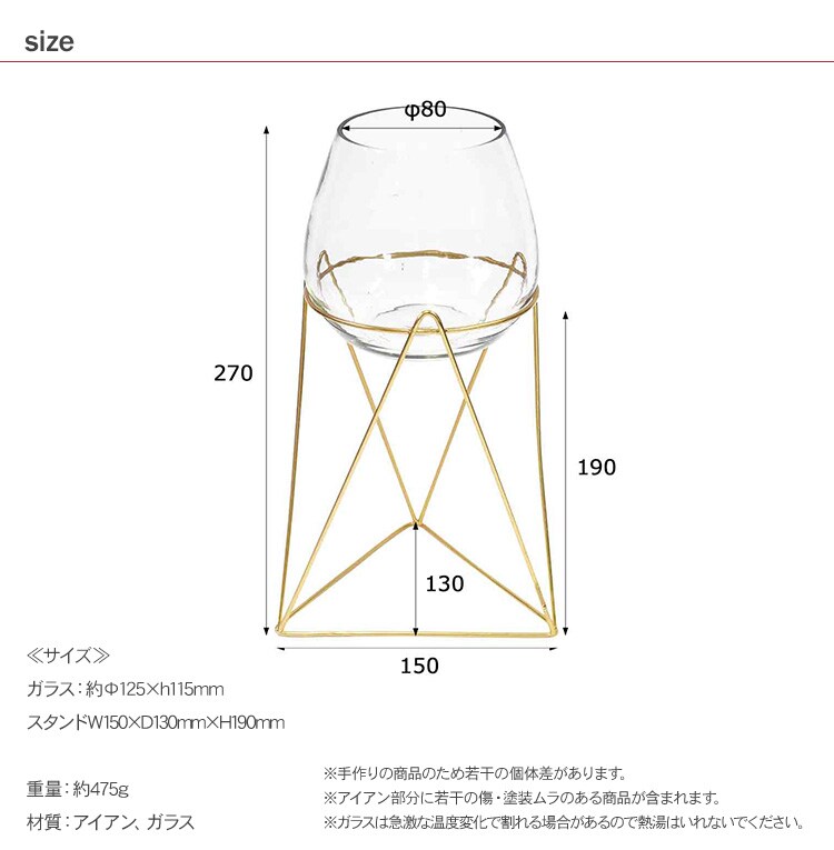 サイズ:ガラス:約Φ125×h115mm 、スタンドW150×D130mm×H190mm