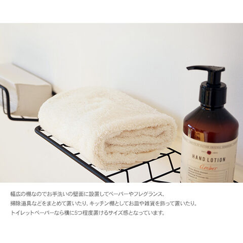 幅広の棚なので、お手洗いの壁面に設置してペーパーやフレグランス、掃除道具などをまとめて置いたり、キッチン棚としてお皿や雑貨を飾って置いたり。