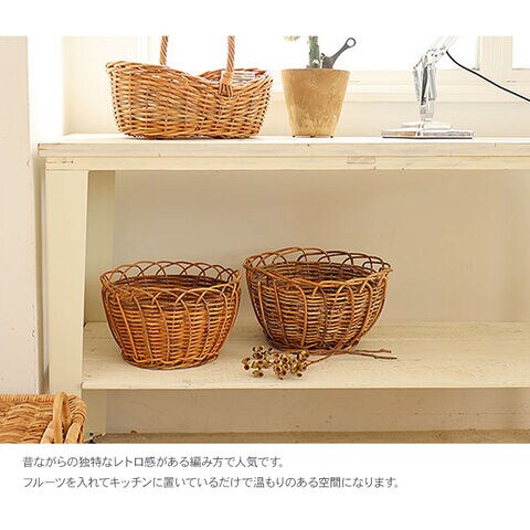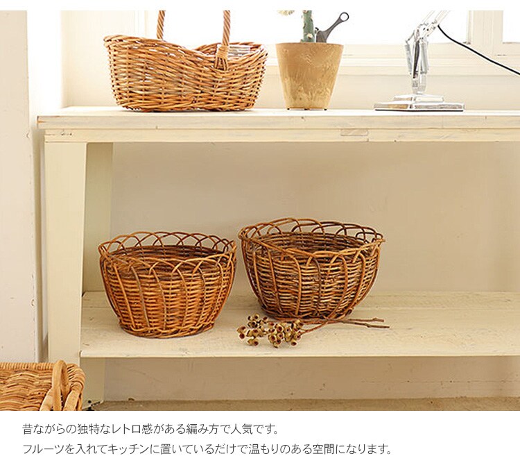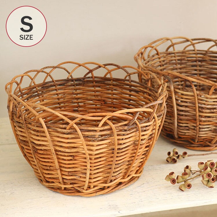 商品説明:ヨーロッパのアンティークデザインを思わせる、 風合い豊かな皮つきラタンストレージバスケット。
