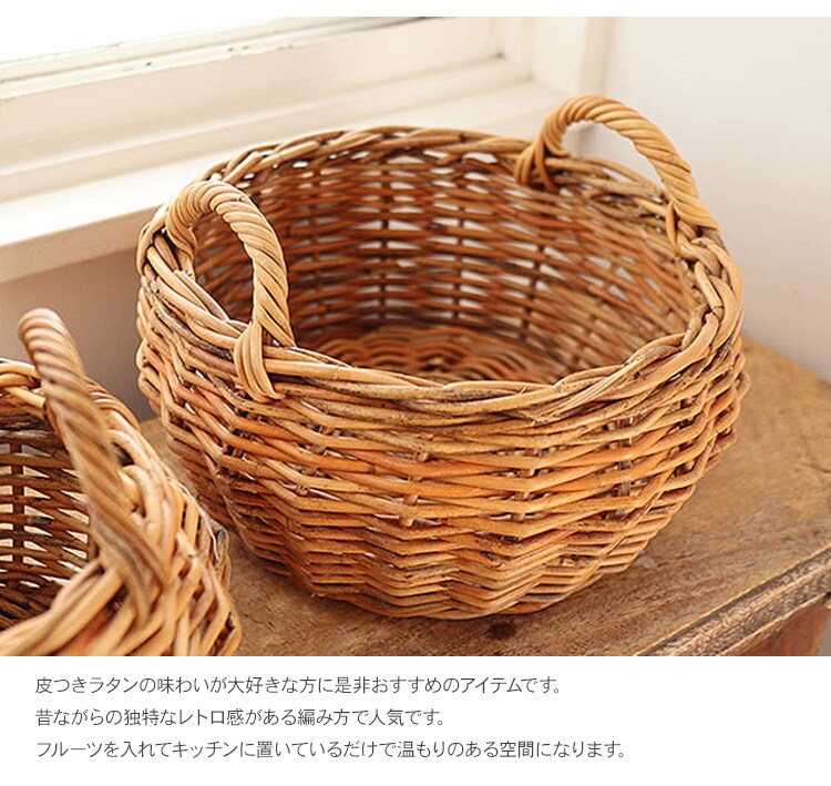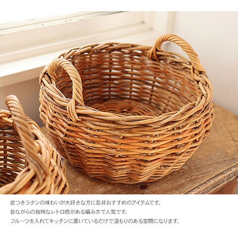 ヨーロッパのアンティークデザインを思わせる風合い豊かな皮つきラタンストレージバスケット。