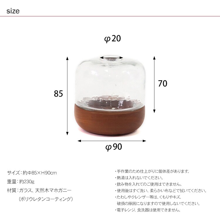 商品説明:ハンマートーン仕上げのガラスとマホガニー製の土台がセットになったフラワーベースです。